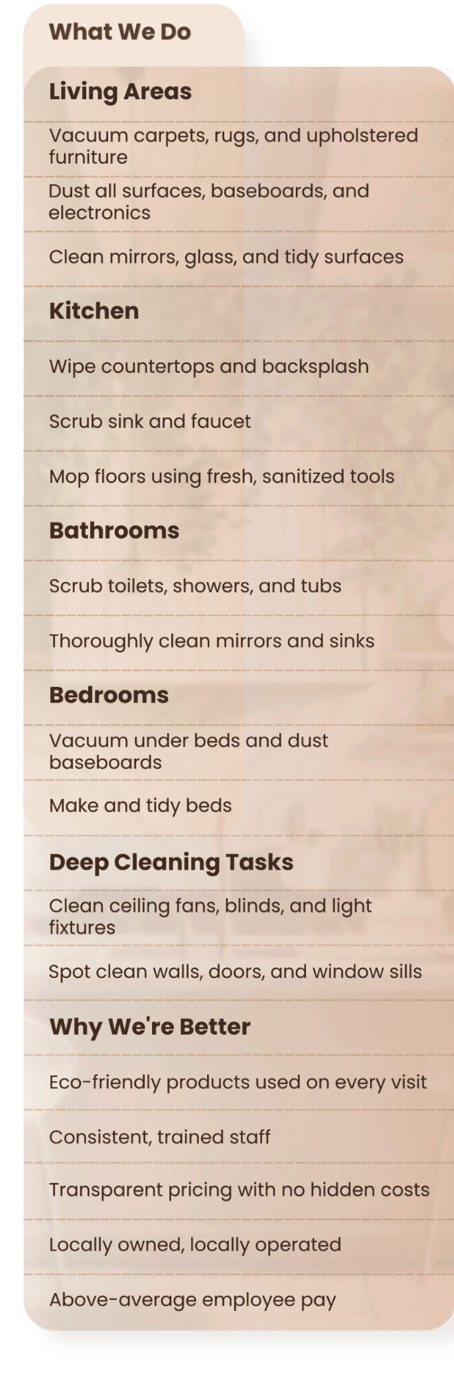 We provide a complete cleaning experience every time—no deep-cleaning add-ons needed. Here’s why homeowners love us: